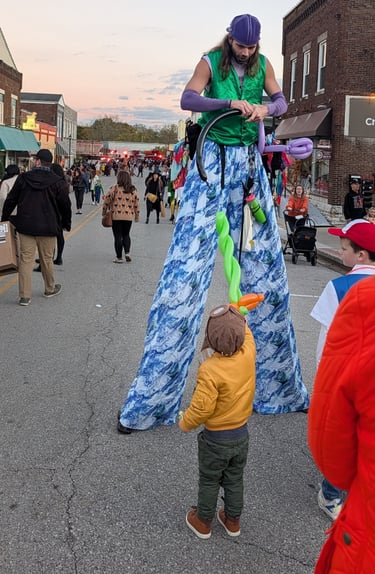Yanni towers above the crowd (literally) while juggling, joking, and crafting balloon animals for kids and adults alike. His high-energy shows turn sidewalks into stages and walkways into memories.