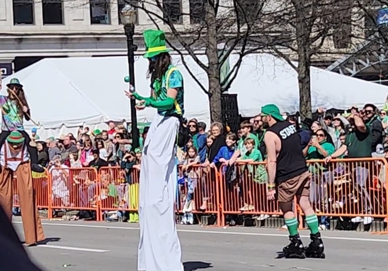 Stilts and juggling balls flying high draw people in from blocks away — the perfect crowd magnet.